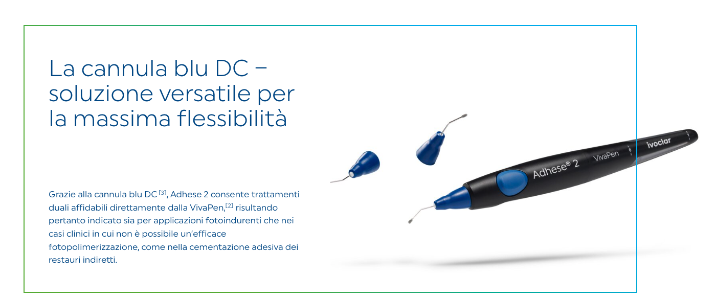 - Campo di applicazione più ampio grazie all’innovativa cannula blu DC per trattamenti duali (per es. per la cementazione adesiva di restauri indiretti e perni canalari)