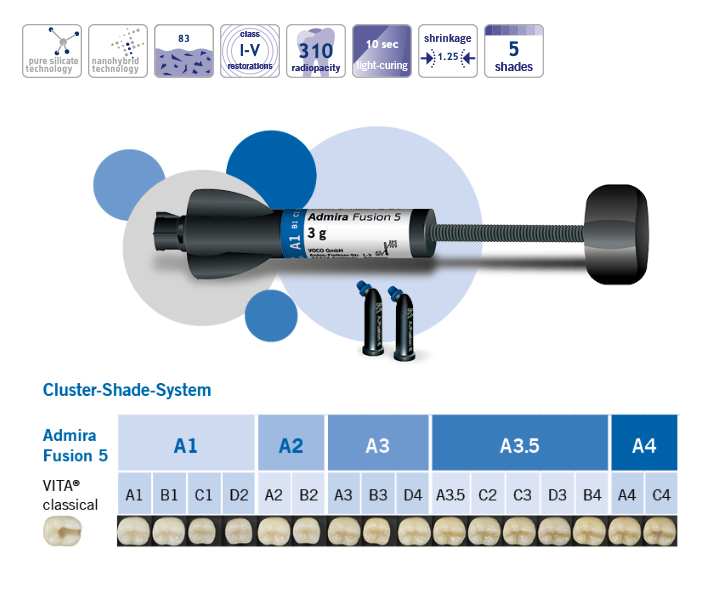 Admira Fusion 5 utilizza cinque colori Cluster, ognuno dei quali raggruppa diversi colori della scala VITA®. Ciò consente un adattamento al colore naturale del dente e di selezionare il colore in modo più semplice ed efficiente. Grazie al sistema di colori semplificato, tutte le 16 tonalità VITA® classical possono essere incluse in soli cinque cluster-shades. La stratificazione di più colori non è necessaria. Così si hanno gli strumenti giusti per soddisfare in modo ottimale qualunque esigenza con soli cinque colori, riducendo quindi significativamente anche lo spazio occupato in magazzino. In questo modo si ottiene una migliore visione d’insieme e si risolve il problema degli articoli mancanti.