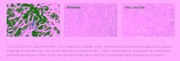Grazie alla sua formula, Aquasil Ultra + sfrutta la naturale umidità del dente, riducendo i vuoti e la formazione di bolle ai margini delle preparazioni e garantendo la stabilità dell’impronta da trasferire al laboratorio.
