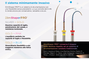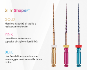 Il sistema di strumenti rotanti SlimShaper® offre una flessibilità mai vista prima*. Inoltre, grazie alla conicità del 4%, è un sistema meno invasivo e molto più sicuro. I manici colorati facilitano la rapida identificazione della lega necessaria in ciascun momento del trattamento.