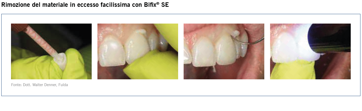Bifix SE ha una proprietà fluida ottima che umidisce l’intera cavità e il restauro ciò che facilita notevolmente l’applicazione e la rimozione del materiale in eccesso. Si può rimuovere il materiale in eccesso facilmente con uno scaler o un dispositivo simile nella fase gel dopo una breve esposizione alla luce di solo 1 – 2 secondi per superficie. Grazie alla polimerizzazione chimica, Bifix SE è adatto perfettamente anche per restauri opachi, con bordi grossi e di ogni profondità di cavità. Restauri diretti sono sempre una grande sfida per compositi di cementazione. I materiali sono esposti tra l’altro a carichi masticatori, diverse temperature e attacchi acidi. Già la saliva ovunque nella bocca può influire negativamente i materiali dentali.