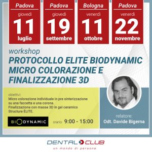 Dental Club vi propone questo super Workshop “Protocollo Èlite Biodynamic micro colorazione e finalizzazione 3D”, relatore Odt. Davide Bigerna, primo appuntamento giovedì 11 luglio dalle ore 9 alle 15 presso la nostra sede di Limena (PD)! Info e prenotazioni Dental Club S.p.A. sede di Limena (Pd) Tel 049 7662870 Mail padova@dentalclub.it Abstract Micro colorazione...