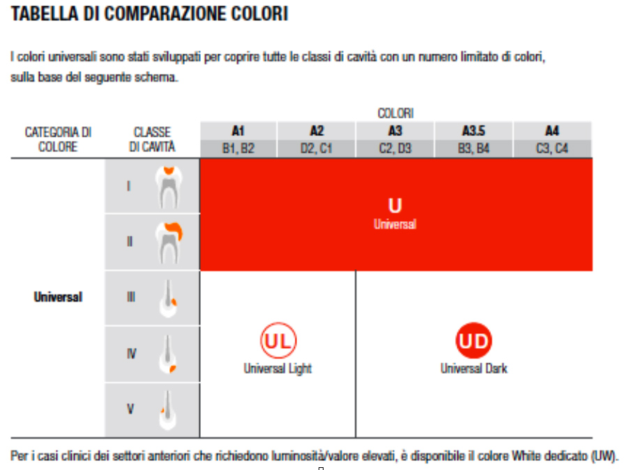 - Colori UL (Universal Light) e UD (Universal Dark): per settori anteriori