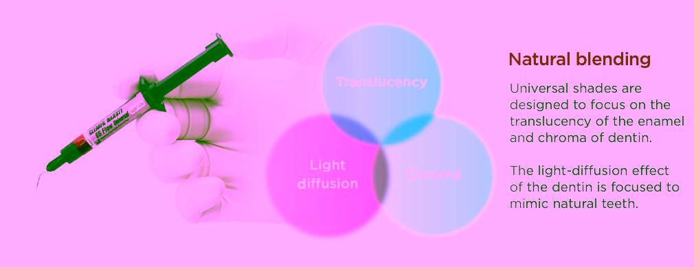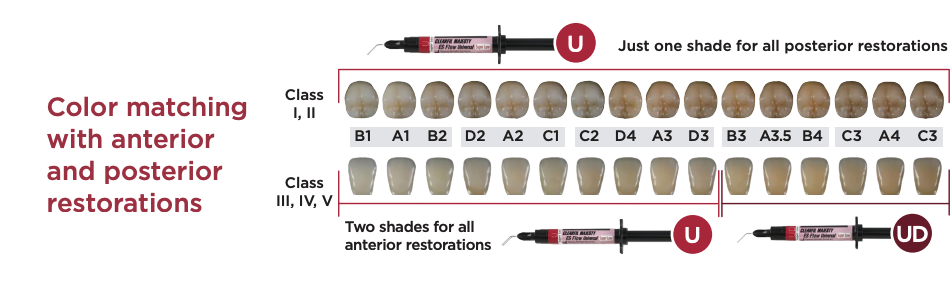 CLEARFIL MAJESTY ES-2 Universal permette di utilizzare un solo colore Universal (U) per i restauri posteriori e di scegliere tra 2 opzioni di colore, Universal Light (UL) e Universal Dark (UD), per i restauri anteriori dove vi è una maggiore esigenza estetica.