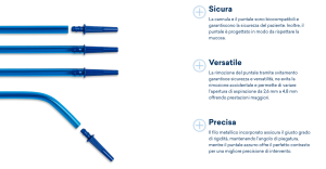Cannula sterile flessibile adatta per l’aspirazione chirurgica specialmente per operazioni di apicectomia, innesti gengivali e per interventi di implantologia con spazio operativo limitato. Ideale nelle aree difficili da raggiungere, come negli interventi sugli ottavi. La possibilità di flettere la cannula e di svitare il puntale le permette di adattarsi alle diverse esigenze di aspirazione durante...