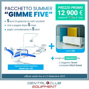 Acquista il pacchetto completo Riunito Diplomat Model One 100 + Linea Mobili Loran: ricevi in OMAGGIO a scelta 2 seggiolini Score Dental o la lampada Ultradent VALO Grand!!! 5 anni di garanzia su tutti i prodotti Inizi a pagare dopo 5 mesi Paghi comodamente in 5 anni Scopri la super promo del pacchetto Summer “GIMME FIVE”...