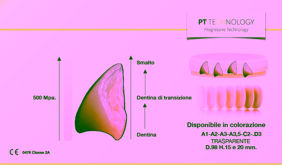 • Colorazione disponibile: Dentina Progressiva + smalto A1-A2-A3-A3,5-C2-D3, Trasparente.