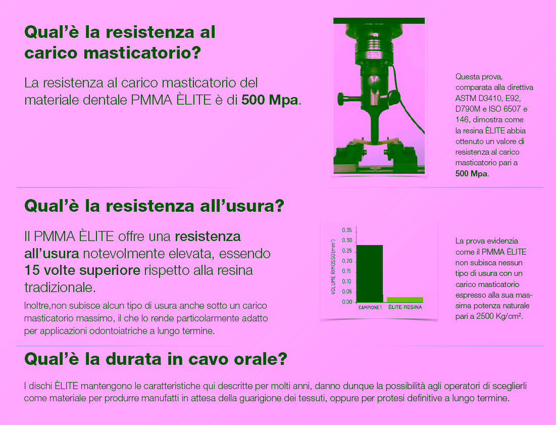 Il nuovo PMMA ÈLITE è un materiale dentale biocompatibile e citotossico di grado 0, con resistenza al carico masticatorio di 500 MPa e resistenza all’usura 15 volte superiore alla resina tradizionale. Offre efficacia antimicrobica contro diversi microrganismi e mantiene le sue caratteristiche molti anni.