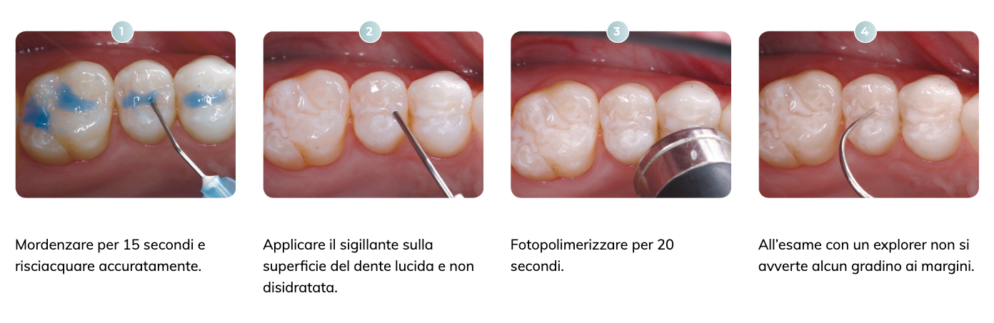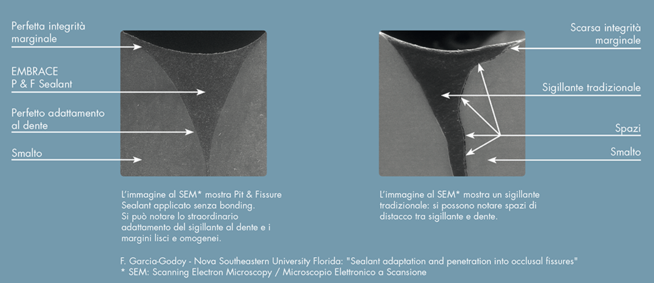 Il sigillante EMBRACE Pit & Fissure Sealant presenta proprietà idrofile uniche che garantiscono un’adesione particolarmente efficace in ambiente umido. La resina forma un’intima associazione con la superficie umida del dente e si integra perfettamente creando un’interfaccia priva di margini tra resina e smalto, che resiste alle microinfiltrazioni. L’assenza di margini sondabili, le sue proprietà antibatteriche, la capacità di ricaricarsi di fluoro e la sua storia di successi a lungo termine, sono ampliamente riportati in letteratura.