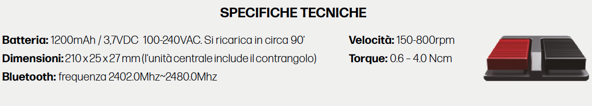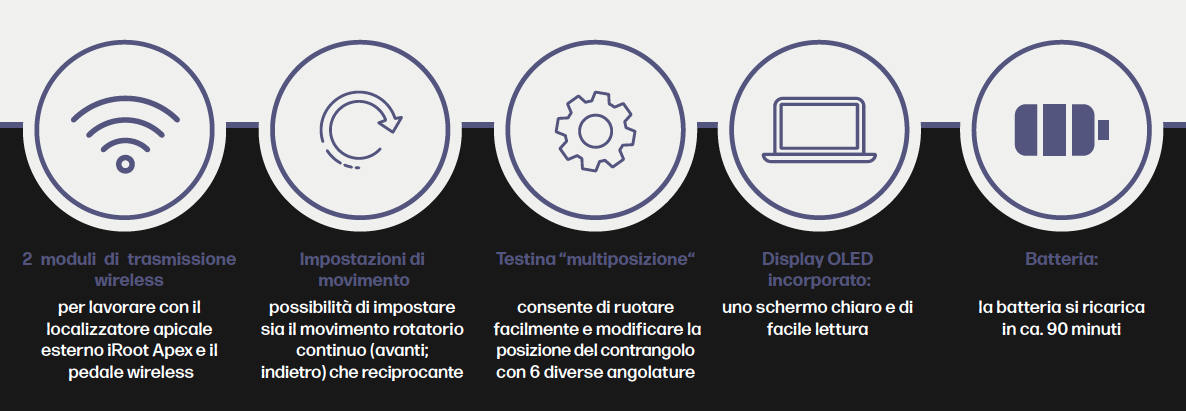 Diverse modalità disponibili -> “Auto reverse”, “reverse”, Auto reciprocante”: è compatibile con sistemi di strumentazione meccanica rotante e reciprocante, permettendo di adattarsi a diverse tecniche.