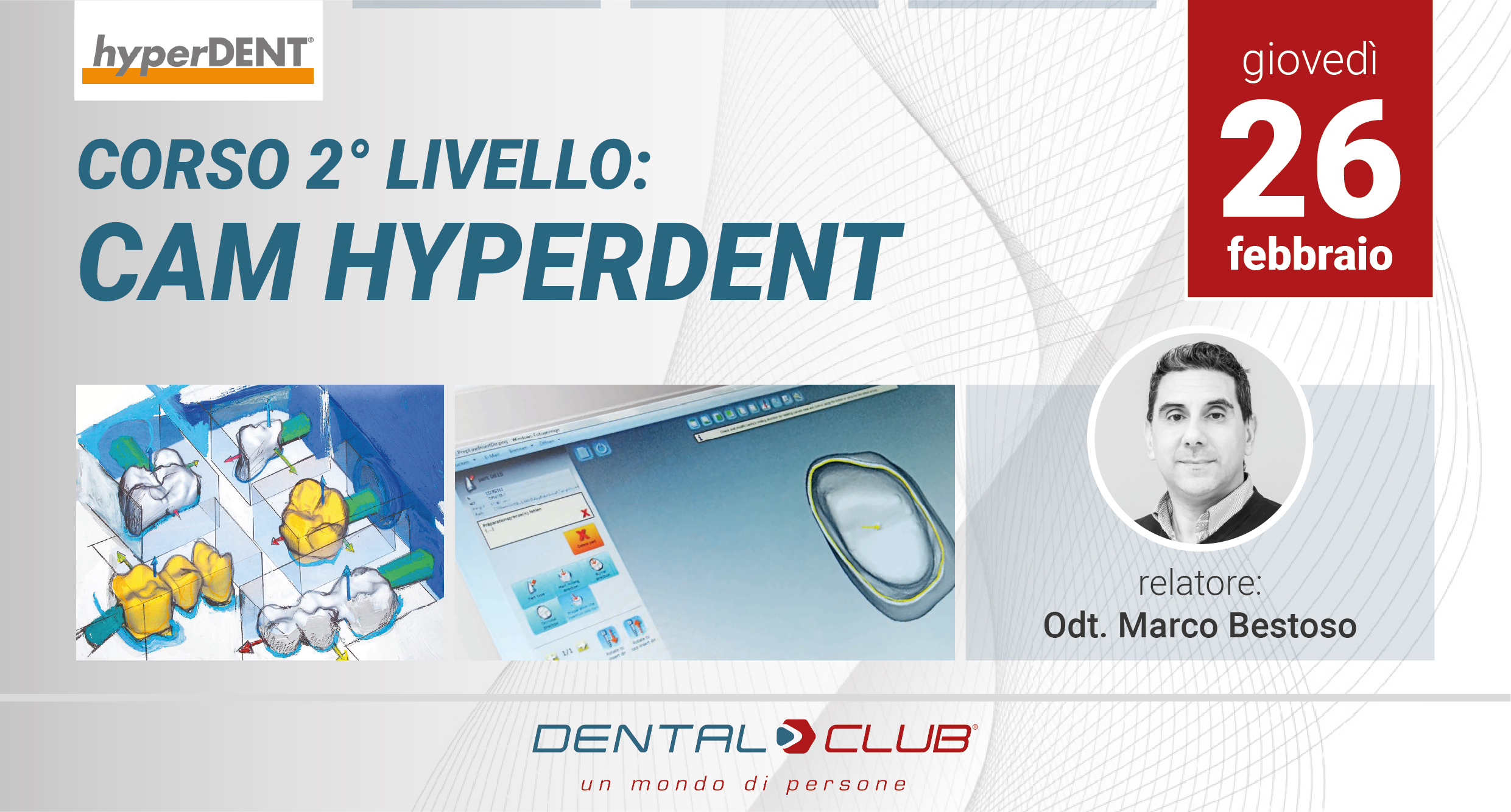 Qui sotto trovi l’elenco aggiornato di tutti gli eventi formativi e workshop in programma con date, sedi e orari. Il calendario ti permette di esplorare i corsi, serate e momenti di aggiornamento professionale organizzati da Dental Club e di accedere ai dettagli di ciascun appuntamento per iscriverti o saperne di più.