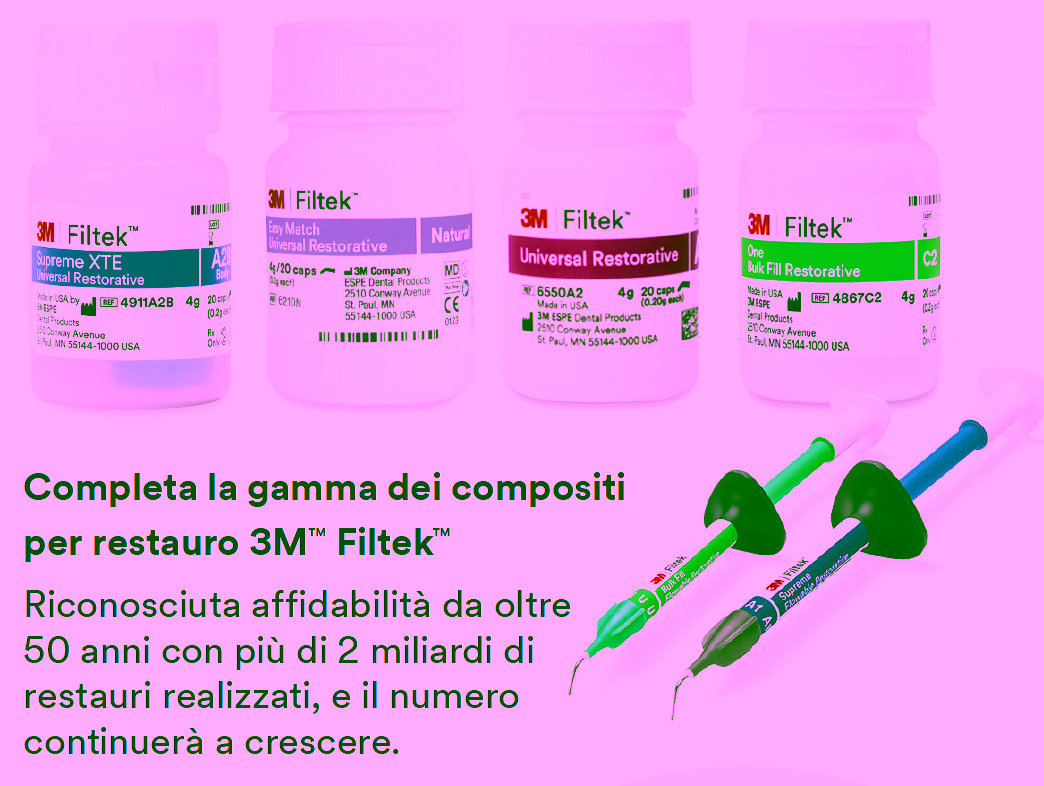 La VERA nanotecnologia dei compositi 3M™ Filtek™ ha aiutato gli odontoiatri di tutto il mondo a realizzare più di 2 miliardi di restauri. Filtek™ offre una gamma di compositi per eseguire qualsiasi caso clinico: sia per anteriori che per posteriori, dall’estetica di alto livello alle procedure altamente efficienti. Sia che tu abbia bisogno di un composito universale, un composito flow o bulk fill, per settori anteriori o posteriori, la gamma Filtek™ ti offre soluzioni estetiche ottimali ed altamente efficienti.