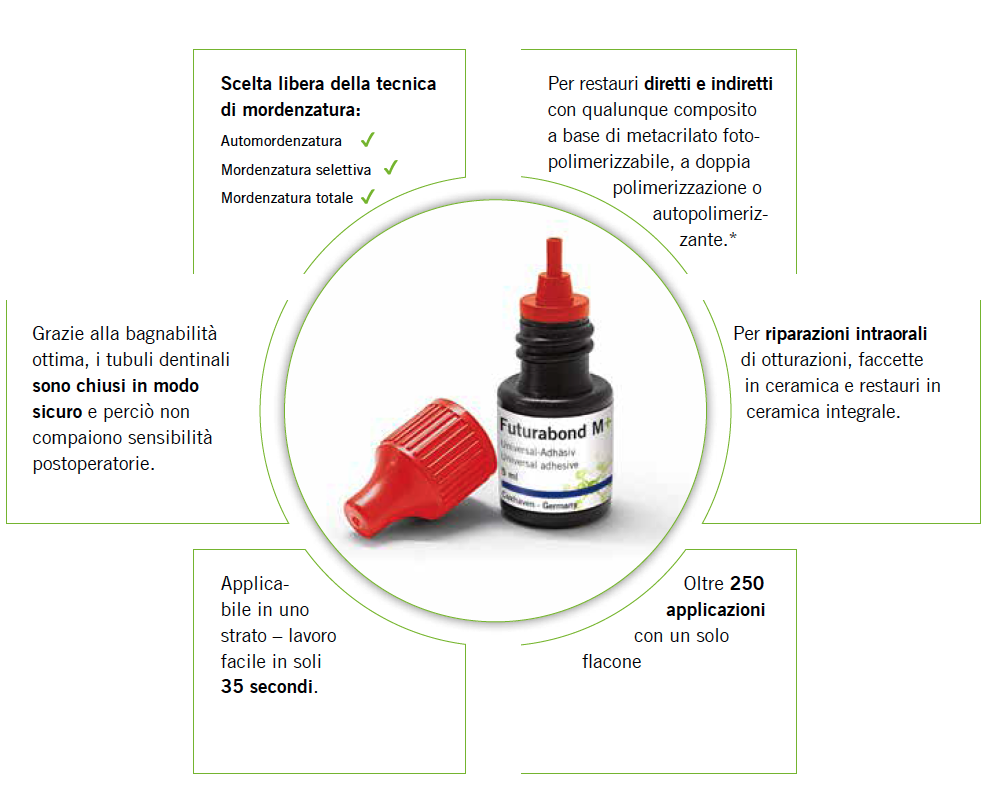 Ora non ce n‘è più bisogno perché con Futurabond M+ si ottiene risultati molto migliori. Oltre all‘applicazione universale, Futurabond M+ dà la scelta libera del condizionamento del tessuto duro dentale con acido fosforico ad ogni dentista. Grazie alla nuova tecnologia di monomeri non è più possibile mordenzare la dentina eccessivamente e quindi si può evitare che il paziente soffre di sensibilità postoperatorie.