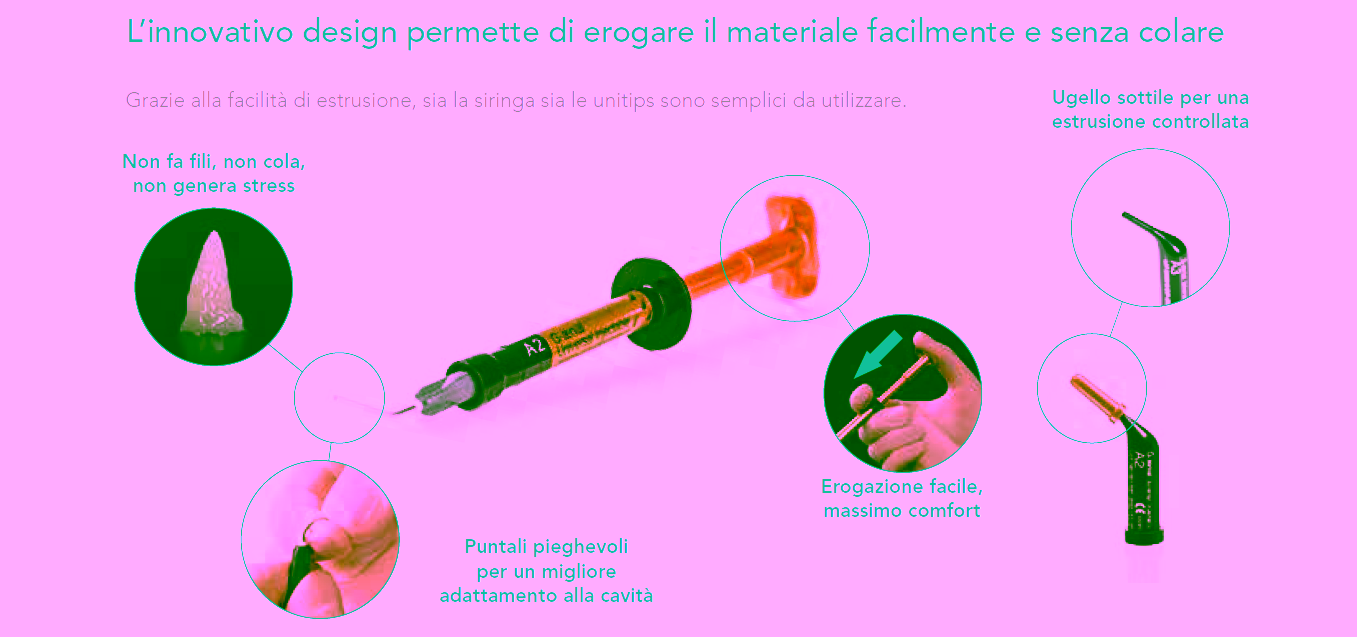Le moderne tecnologie leader mondiali hanno permesso a GC definire un nuovo standard per i compositi con un prodotto che offre resistenza eccezionale, lucidabilità insuperabile ed estetica eccellente caratterizzata una perfetta integrazione con i denti naturali. Ma ciò che vi sorprenderà è la possibilità di iniettarlo e contemporaneamente modellarlo con semplicità. Il materiale si adatta perfettamente al fondo della cavità ma vi permette di costruire, modellare e definire i contorni mentre iniettate – perché G-ænial Universal Injectable non scivola!