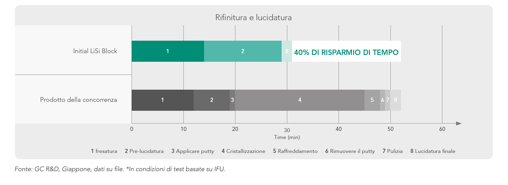 Initial LiSi Block può ridurre drasticamente i tempi del processo di lavorazione: non è necessario il passaggio in forno, quindi, glasare, caratterizzare e raffreddare. Ciò consente di risparmiare fino al 40% del tempo*, riducendo il tempo alla poltrona per te e il tuo paziente. Hai solo bisogno di fresare, lucidare e cementare!