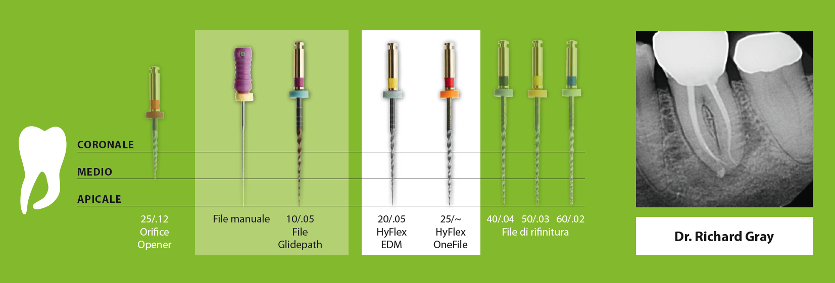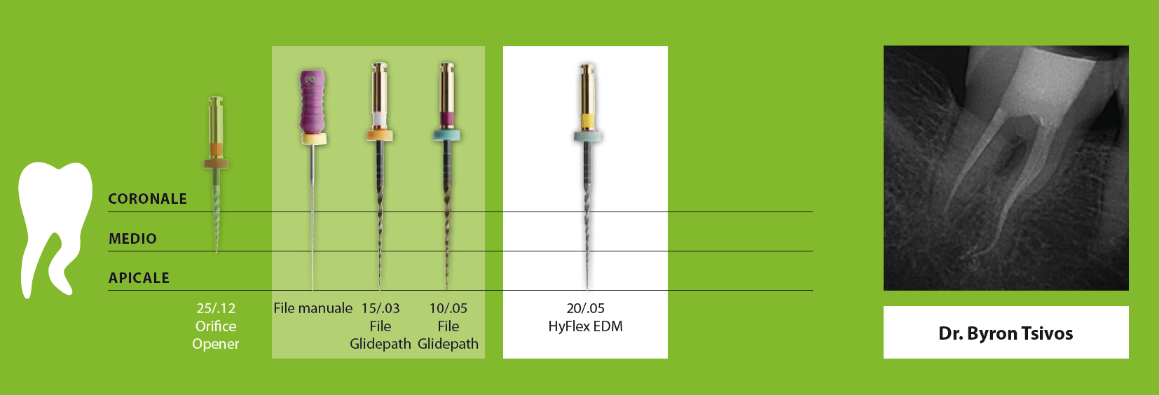 L’uso dei file HyFlex EDM consente di ridurre il numero di strumenti. Nei canali piccoli e diritti, l’uso di HyFlex OneFile può essere sufficiente. Il numero dei file può essere ridotto o aumentato a seconda della situazione clinica. Tutti i file HyFlex EDM NiTi devono essere usati alla velocità di 400 giri al minuto e con una coppia massima di 2,5 Ncm (25 mNm), tranne i file Glidepath, che devono essere usati a 300 giri al minuto e con una coppia massima di 1,8 Ncm (18 mNm).