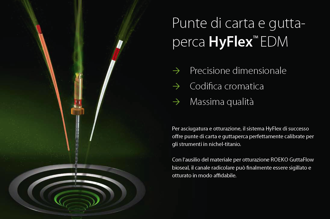 I nuovi HyFlex EDM costituiscono la quinta generazione di strumenti canalari. Gli strumenti in NiTi HyFlex EDM hanno proprietà completamente nuove grazie al loro innovativo processo di produzione, che utilizza l’elettroerosione. In questo modo si ottiene la superficie esclusiva dei nuovi strumenti in NiTi rendendo i nuovi i file HyFlex EDM più durevoli e resistenti alla rottura. Questa combinazione di flessibilità e resistenza alla frattura, unica nel suo genere, rende possibile la riduzione del numero di strumenti necessari per la detersione e la sagomatura durante i trattamenti endodontici senza sacrificare il mantenimento dell’anatomia del canale radicolare. Come HyFlex CM, anche gli strumenti HyFlex EDM possiedono il già noto effetto di memoria controllata (Controlled Memory, CM). Sono prodotti utilizzando un processo esclusivo in cui le transizioni di fase cristallografica austenitica e martensitica avvengono a temperatura ambiente, diversamente dai file in NiTi tradizionali. Questo processo rende gli strumenti estremamente flessibili, resistenti alla frattura e rigenerabili più volte.
