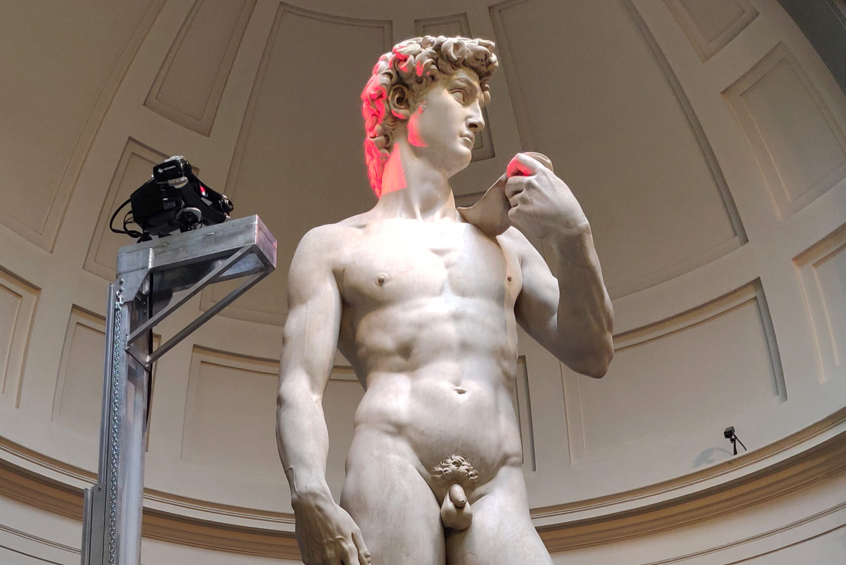 Ricercatori dell’Università di Firenze in collaborazione dei tecnici della Hexagon, multinazionale svedese attiva nel campo dei sensori e delle soluzioni autonome, per la digitalizzazione dell’opera hanno utilizzato due strumenti differenti. Il primo è un tracciatore abbinato ad uno scanner laser con una precisione che si misura in centesimi di millimetro; il secondo strumento, utilizzato per il rilievo delle parti complesse, è un sensore a luce strutturata formato da un proiettore e due telecamere ad alta risoluzione: il proiettore illumina la superficie della statua con delle forme geometriche che servono alle due camere per acquisire le superfici. In pratica, lo scanner è per la figura nel suo insieme; il sensore a luce strutturata è per i dettagli.