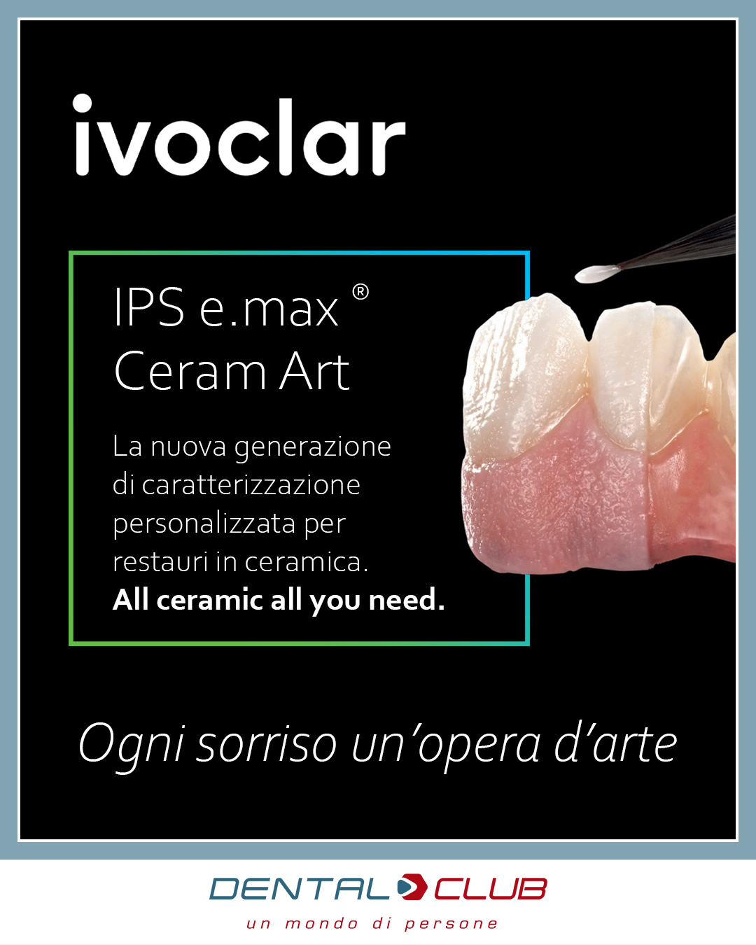 IPS e.max Ceram Art: il nuovo modo di creare superfici in ceramica dal tocco vivace e individuale: una linea innovativa di supercolori universali, glasure e paste per struttura che trasforma i restauri ceramici in opere d’arte. Che si tratti di restauri monolitici, pressati o stratificati, IPS e.max Ceram Art combina forma, colore e struttura con precisione artistica ed efficienza moderna.