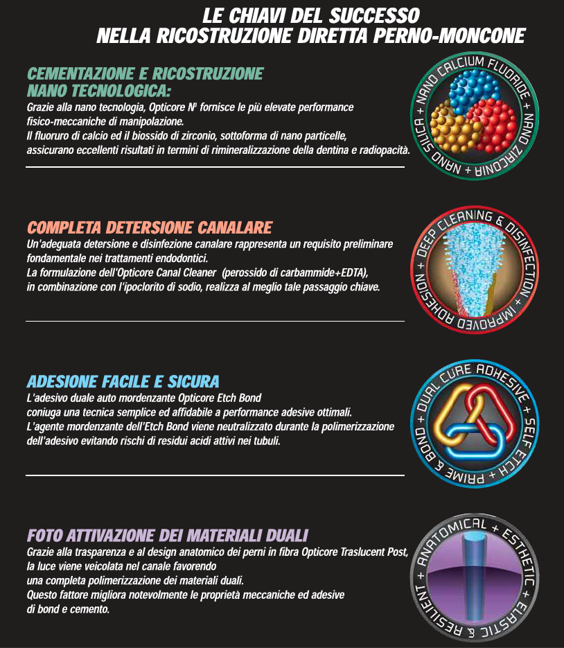 OTTIME PROPRIETA’ ANCHE IN AUTOPOLIMERIZZAZIONE: i materiali duali presentano proprietà fisico-meccaniche peggiori se non vengono anche foto attivati, requisito difficilmente ottenibile all’interno del canale endodontico. Per questo motivo il sistema Opticore, non solo ha sviluppato uno speciale perno traslucente per veicolare la luce nel canale, ma ha anche realizzato un adesivo (Etch Band) ed un cemento endodontico {Opticore N3} che presentano una limitata perdita di performance in assenza di foto polimerizzazione.