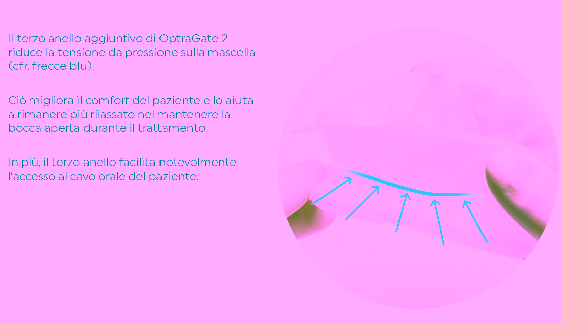 La flessibilità e la consistenza del materiale assicurano il massimo comfort. OptraGate 2 aiuta i pazienti a mantenere la bocca aperta durante il trattamento. Il terzo anello migliora il comfort del paziente e consente di lavorare con maggiore concentrazione.