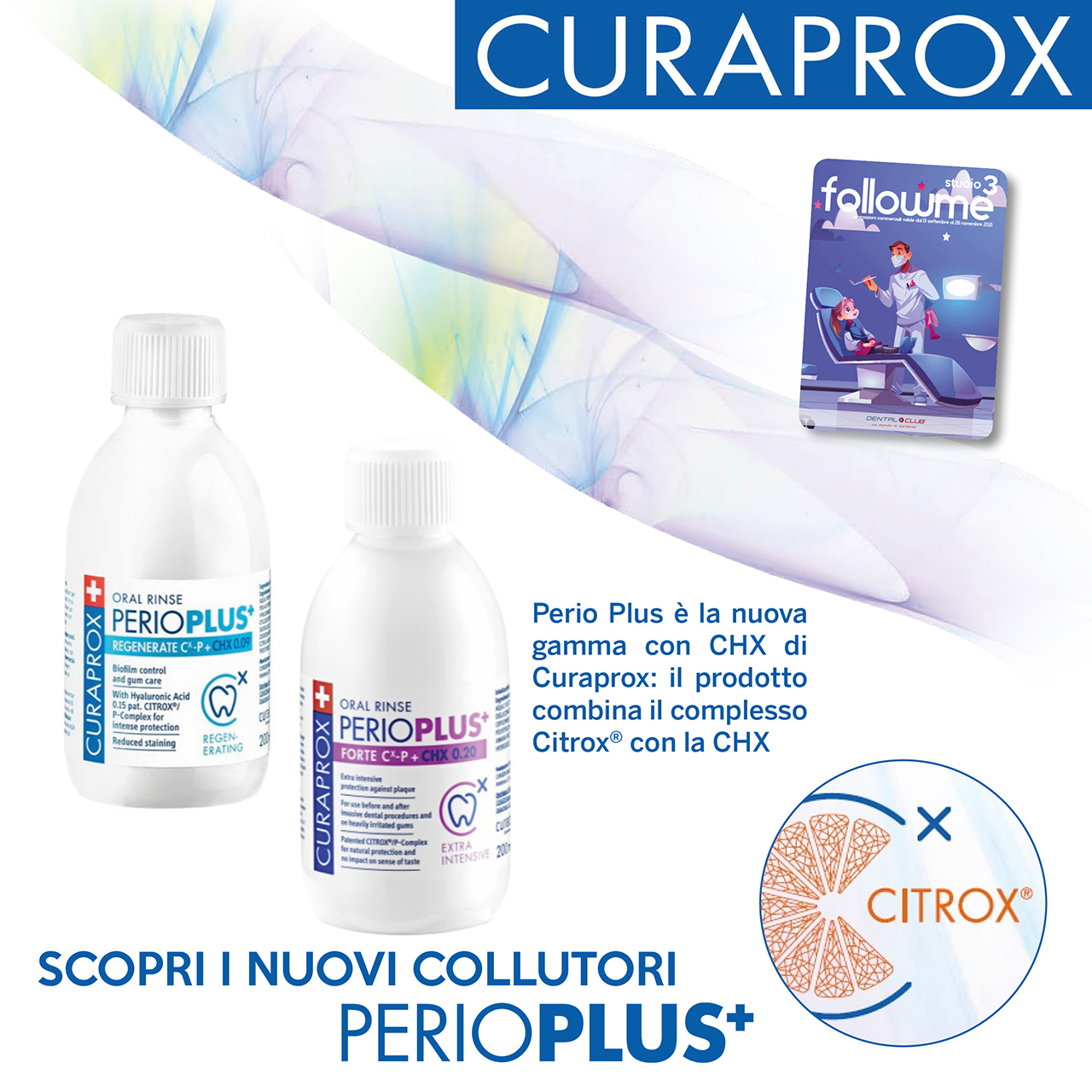 La clorexidina è veramente efficace. Ora esiste «Perio plus», la CHX con qualcosa che ai pazienti interessa: un buon sapore. In più gli effetti collaterali sono ridotti: pigmentazioni quasi assenti, nessuna alterazione del gusto. E ha qualcosa che interessa a voi (e in realtà anche ai pazienti): è particolarmente efficace. «Perio plus» infatti contiene CHX e Citrox®, nove bioflavonoidi naturali estratti dall’arancia amara. Perché? È dimostrato che CHX e Citrox® sono più potenti della sola CHX. La terapia seguita porterà così sicuramente al successo!