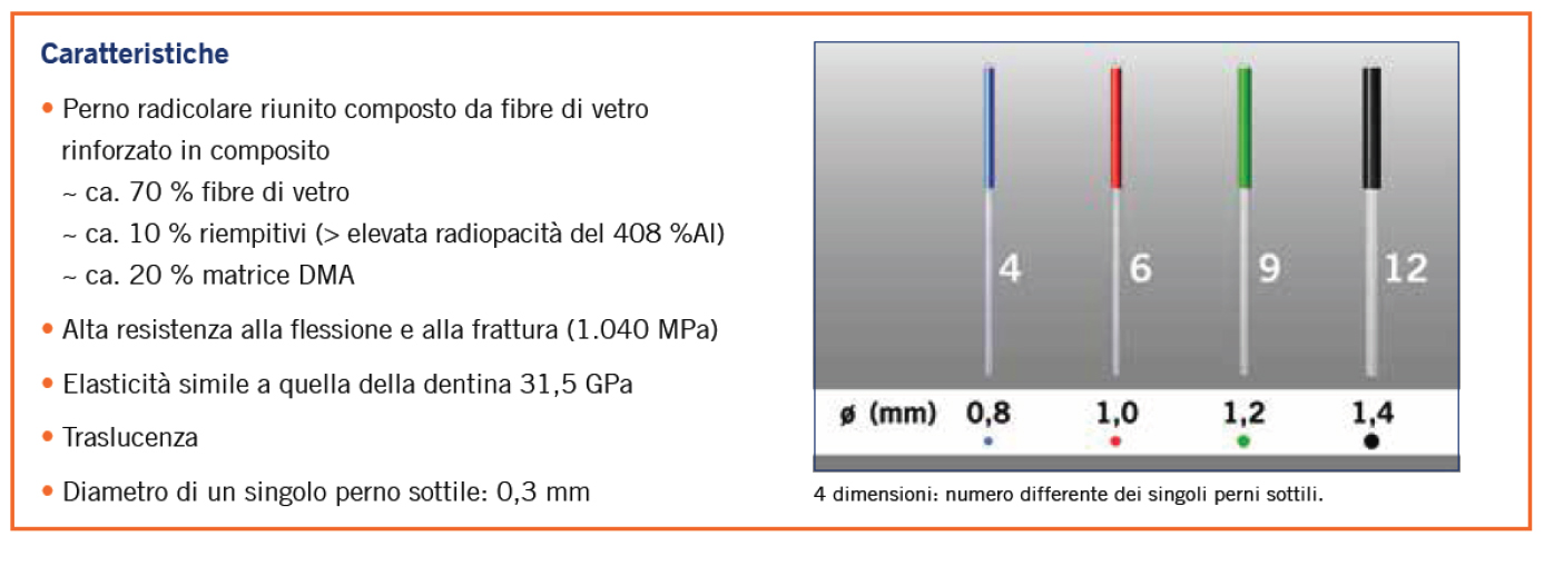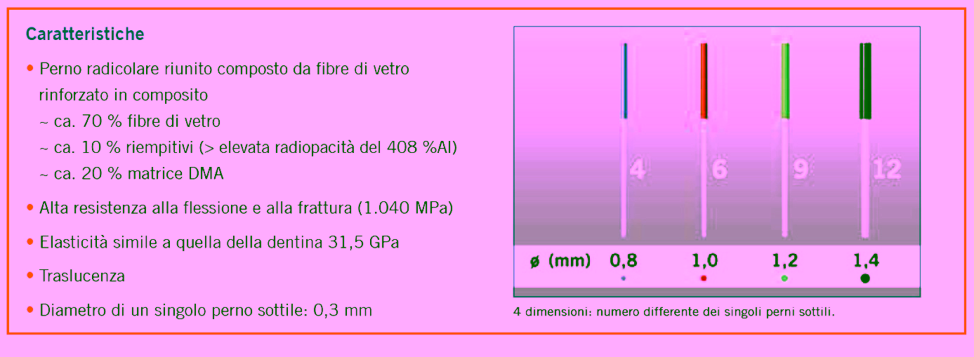 Alcune situazioni cliniche richiedono più di un perno radicolare convenzionale, a causa di un’anatomia atipica del canale radicolare. VOCO ha sviluppato un perno radicolare composto da fibre di vetro rinforzato in composito composto da un fascio di singoli perni riuniti (ø 0,3 mm) a seconda della misura.