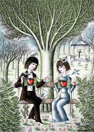 La fervida fantasia di Peynet si mise subito in moto; immaginò che il giovane, dopo la fine del concerto, venisse lasciato solo nel gazebo per suonare quella musica dolcissima per la sua romantica innamorata.