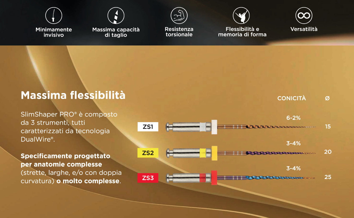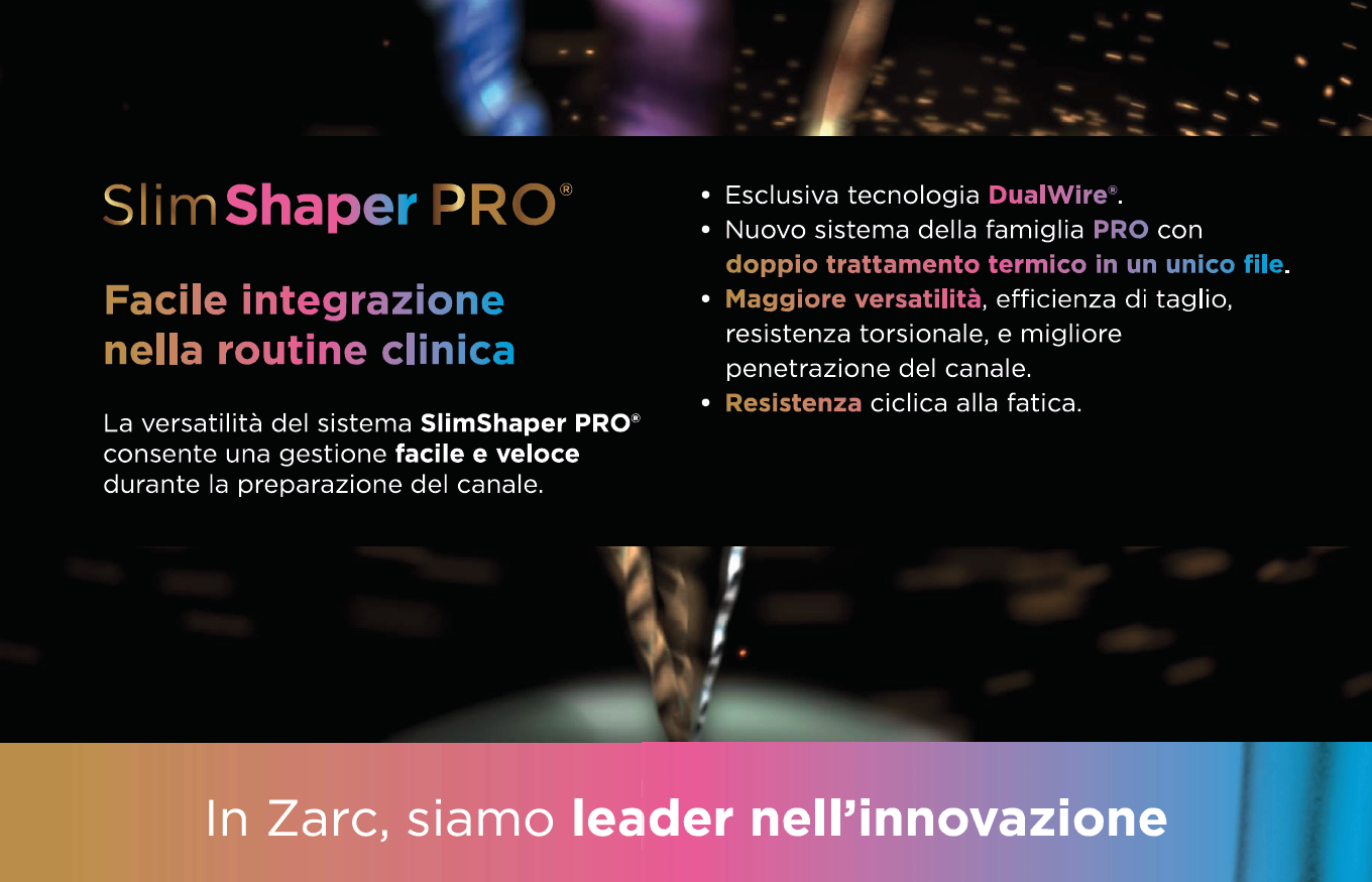 SlimShaper PRO® è un sistema di strumentazione con una flessibilità senza precedenti. La sua conicità del 3-4% lo rende ancora più conservativo, versatile e sicuro.