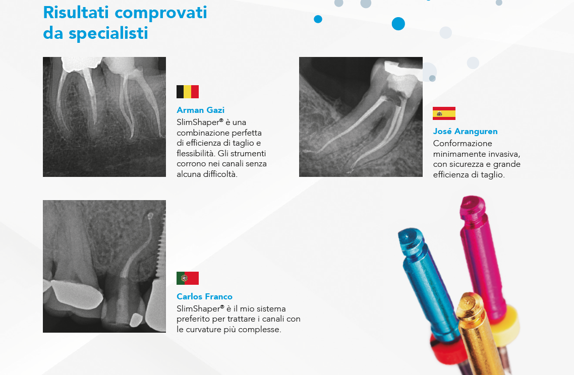 Il sistema di strumenti rotanti SlimShaper® offre una flessibilità mai vista prima*. Inoltre, grazie alla conicità del 4%, è un sistema meno invasivo e molto più sicuro.