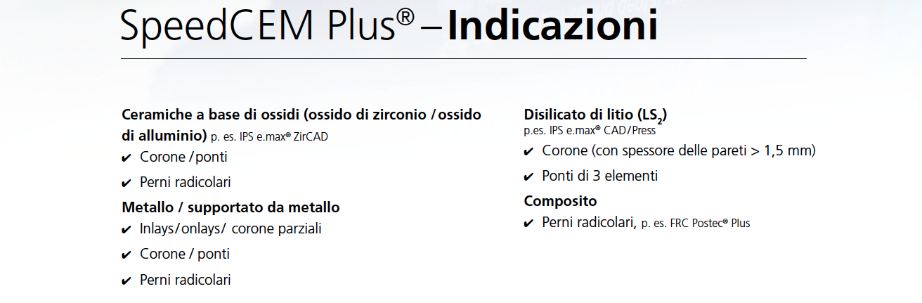 SpeedCEM® Plus di Ivoclar Vivadent è un cemento composito autoadesivo, particolarmente indicato per la cementazione definitiva di restauri in ossido di zirconio e metalloceramica su sostanza dentale dura naturale e su abutment implantari.