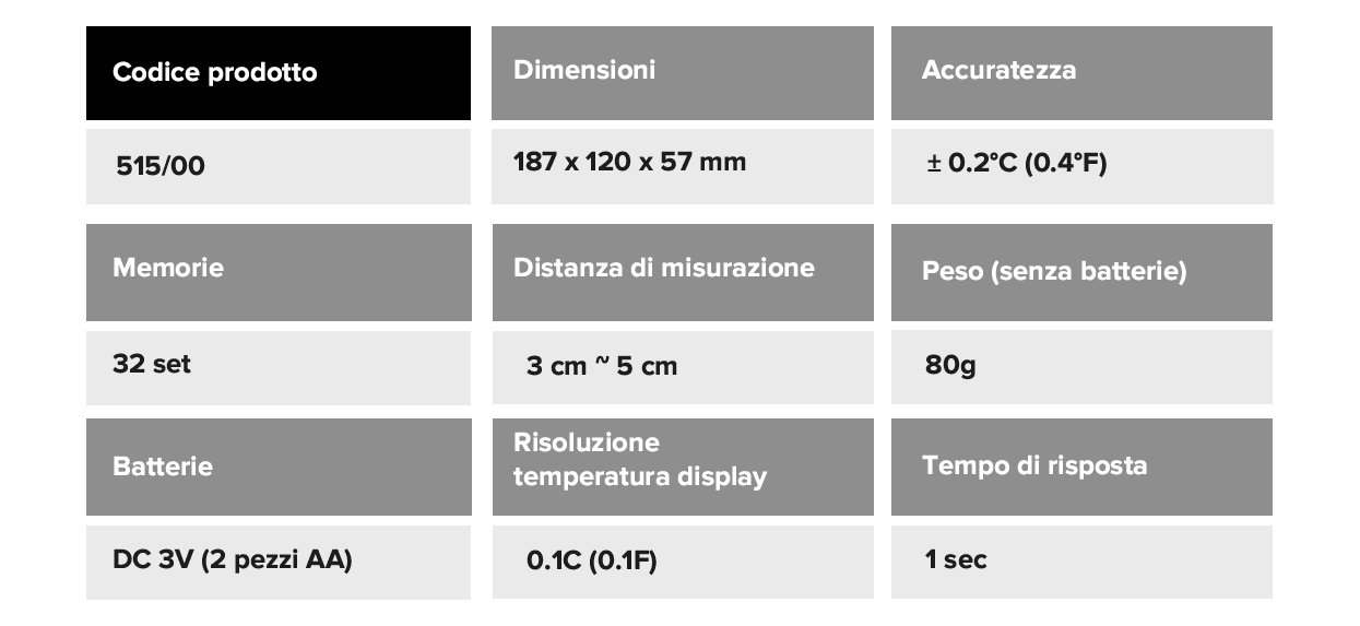 Possibilità di lettura: temperatura corpo, temperatura superficiale, temperatura ambientale. Display retroilluminato a tre colori (in base alla temperatura rilevata).