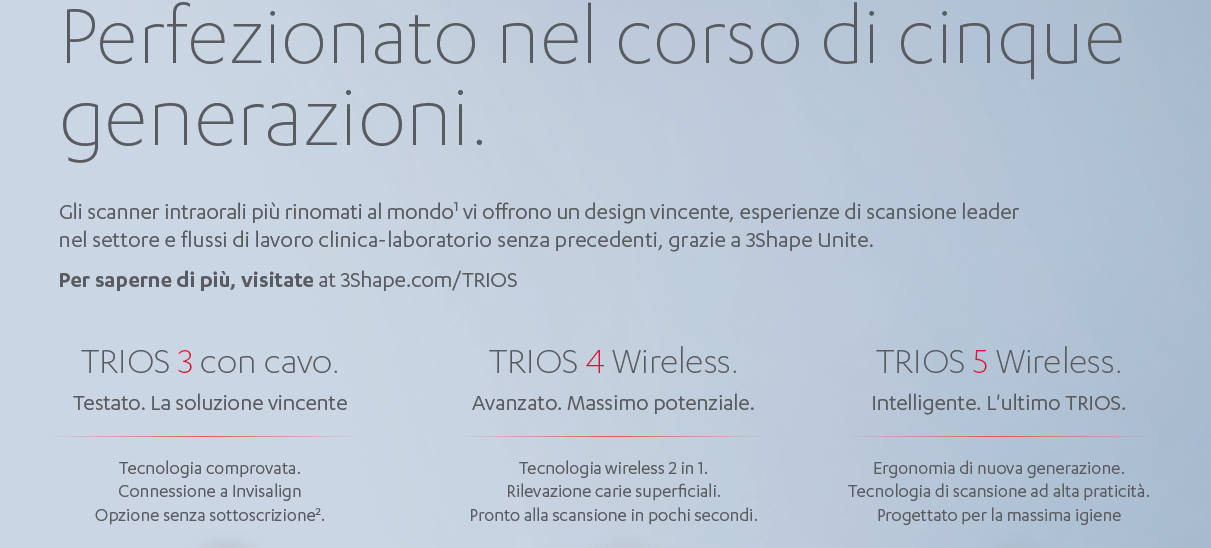 Scoprirete che gli scanner intraorali TRIOS soddisfano i pazienti1 e incrementano il successo del proprio studio. Ci assicureremo che voi abbiate tutto il necessario per digitalizzarvi il più rapidamente possibile. Inoltre, sarete voi a decidere con quali trattamenti iniziare. E se lo vorrete, potrete esplorare nuove indicazioni al vostro ritmo personale.
