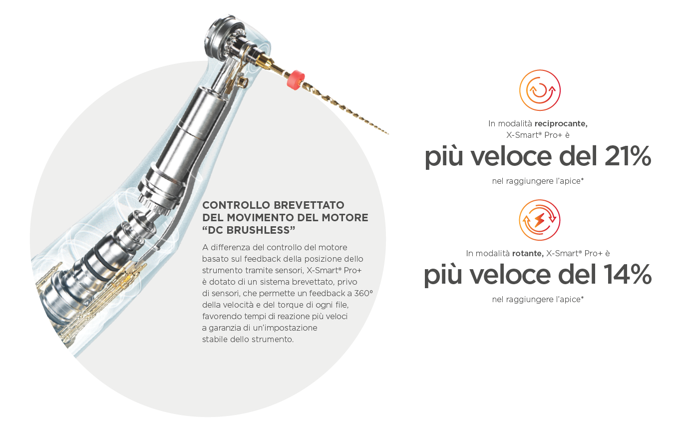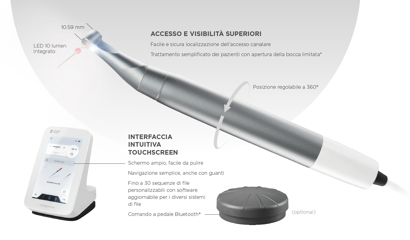 Il motore endodontico X-Smart Pro+ con la possibilità di raggiungere una velocità di 3.000 rpm e fino a 7.5 Ncm di torque, ottimizza la performance dei sistemi di file endodontici Dentsply Sirona, sia in modalità di rotazione continua che reciprocante.