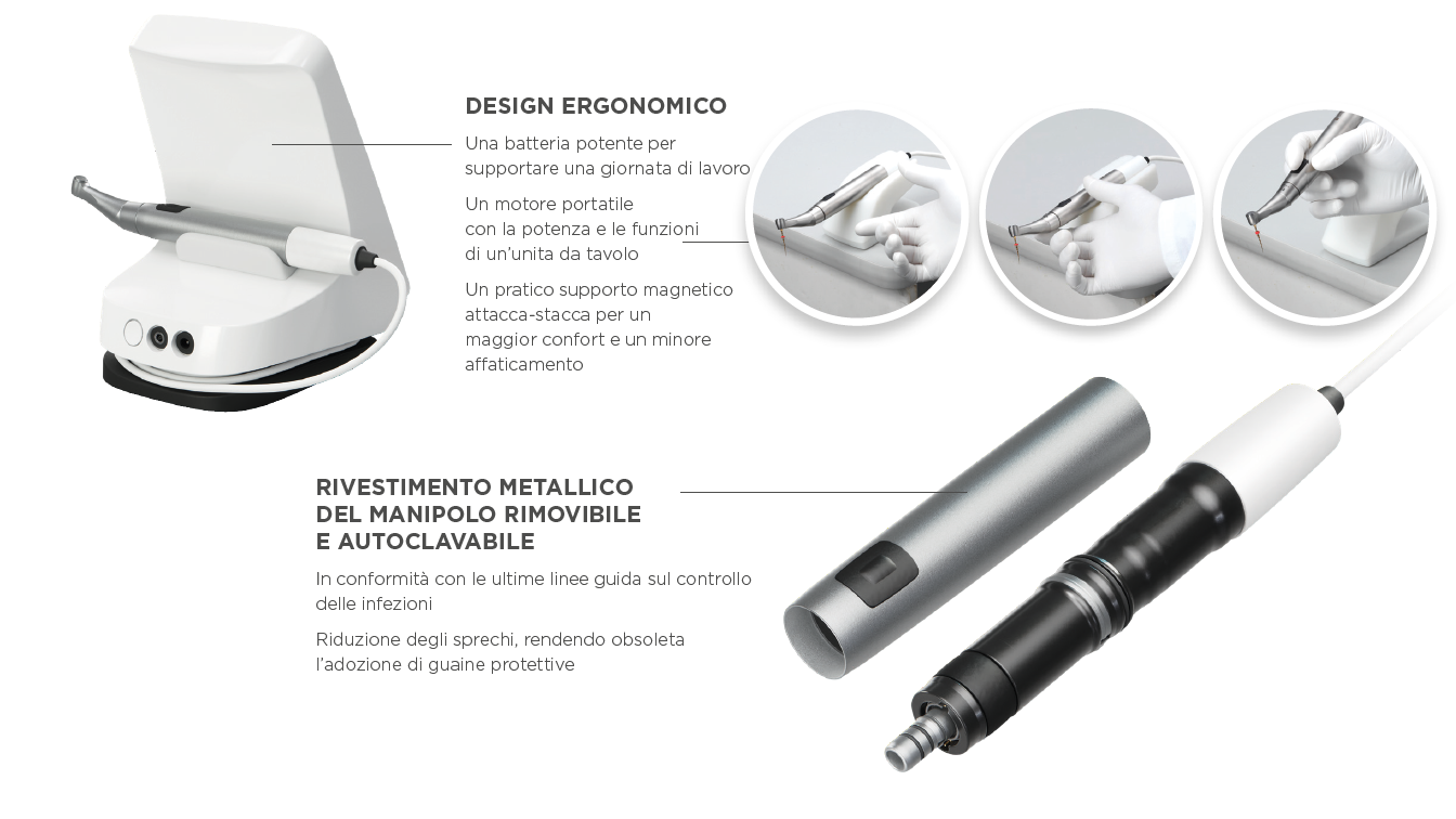 • Rivestimento del manipolo e contrangolo completamente autoclavabili