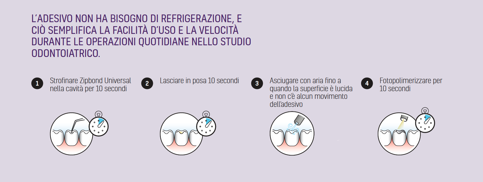 Zipbond Universal è un adesivo universale monocomponente a rilascio di fluoruro, compatibile con tecniche di automordenzatura, mordenzatura selettiva o mordenzatura totale. In presenza di una struttura dentale eterogenea e una varietà di possibilità di restauro, Zipbond Universal raggiunge forze adesive predicibili e affidabili.