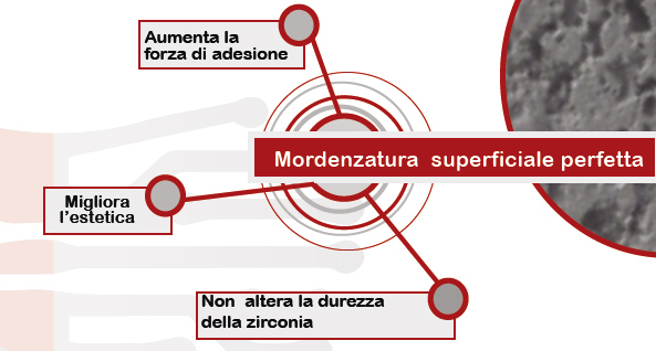 La forza di adesione del cemento è notevolmente aumentata attraverso la mordenzatura della superficie interna della corona. Il metodo di sabbiatura genera uno shock fisico all’ossido di zirconio e allumina che porta a microfratture e degrado a bassa temperatura. Zircos-E Etching Solution attiva gli ioni di superficie dell’ossido di zirconio per rafforzare notevolmente l’adesione alla porcellana aumentando così la superficie porosa dell’ossido di zirconio.